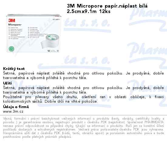 3M Micropore papír.náplast bílá 2.5cmx9.1m 12ks