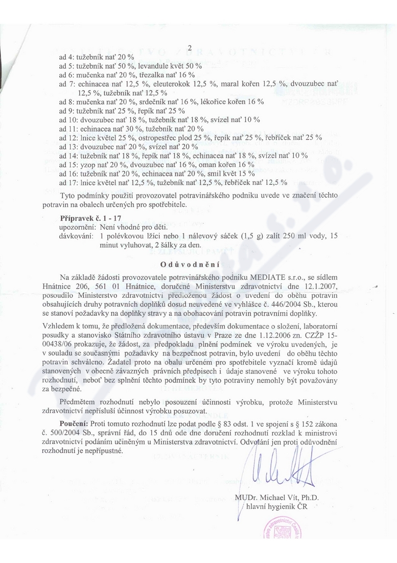 2 strany osvědčení hlavního hygienika: strana 1, strana 2,