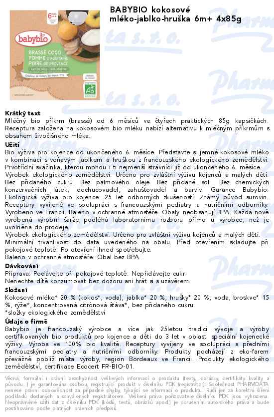 BABYBIO kokosové mléko-jablko-hruška 6m+ 4x85g