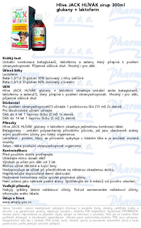 Hlíva JACK HLÍVÁK sirup 300ml glukany + laktoferin