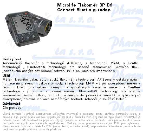 Microlife Tlakoměr BP B6 Connect Bluet.dig.+adap.