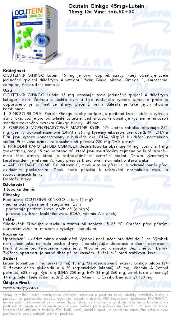 Ocutein Ginkgo 45mg+Lutein 15mg Da Vinci tob.60+30