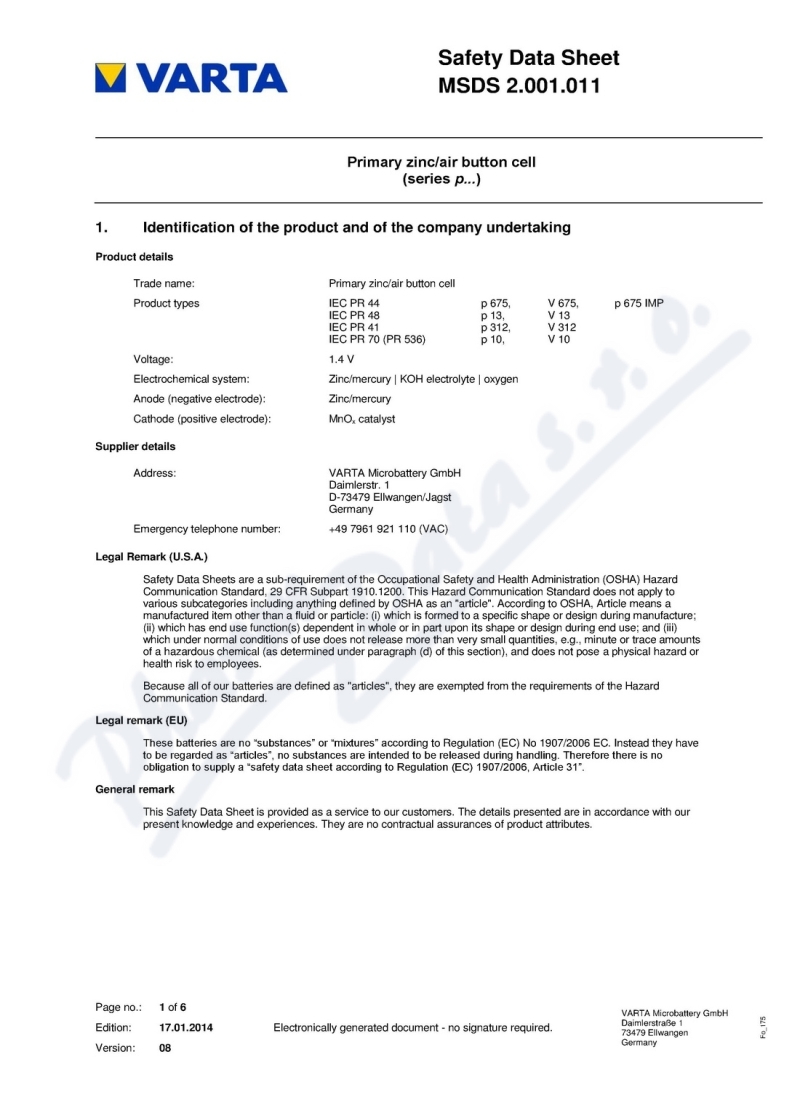 6 strany bezpečnostních listů: strana 1, strana 2, strana 3, strana 4, strana 5, strana 6,