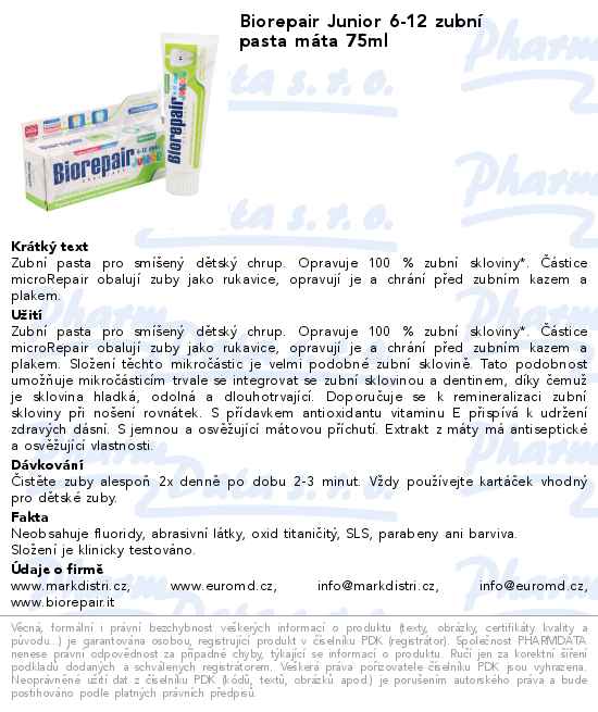 Biorepair Junior 6-12 zubní pasta máta 75ml