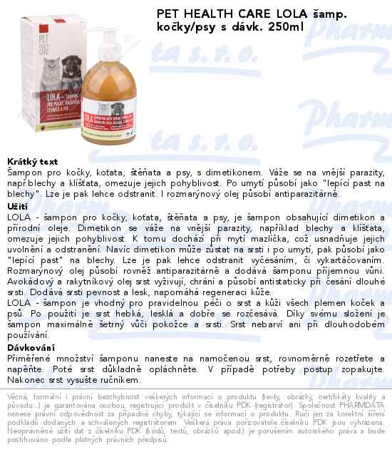 PET HEALTH CARE LOLA šamp. kočky/psy s dávk. 250ml
