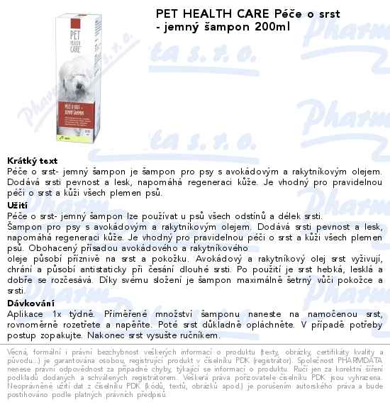 PET HEALTH CARE Péče o srst - jemný šampon 200ml